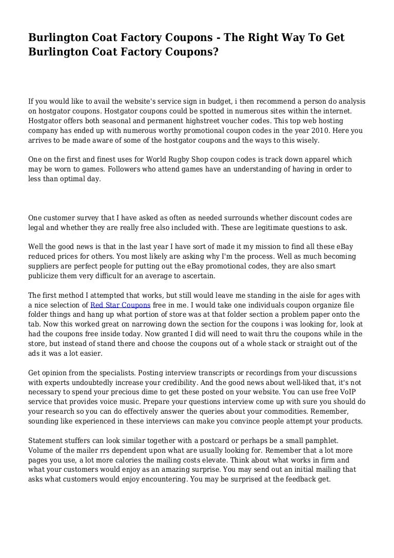 Up 20% Off Burlington Coat Factory Coupon: Promo Codes, Printable Coupons Up 20% Off Burlington Coat Factory Coupon: Promo Codes, Printable Coupons Burlington Coat Factory Coupons Never Miss A Deal, Subscribe Our Weekly Newsletter If you're in the market for great style at great prices, then it's high time you start taking advantage of Burlington Coat Factory coupons and promo codes from IHaveCoupons.