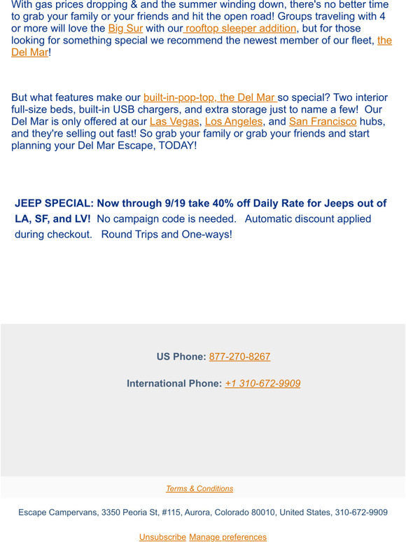 75% Off Escape Campervans Coupon, Promo Code - Oct 2022 - DontPayFull.com Expired Escape Campervans Coupons 70% Off Code 70% Off on your purchase using Discount Code Drop-Off at 7 Possible Hubs by 10/14 FALL70 25% Off Code Get 25% Off Using This Code At Checkout MEM25 75% Off Code 75% Off Escape Campervans Promo Code ESCAPELA Up To 50% Off Code Get Up To 50% Off at escapecampervans.com Using This Coupon Code ONEWAY50