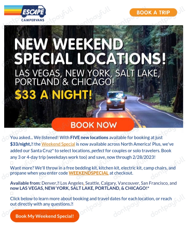 2022 Escape Campervans Coupons and Promo Code - CouponBirds Get 60 Escape Campervans coupon codes and promo codes at CouponBirds. Click to enjoy the latest deals and coupons of Escape Campervans and save up to 75% when making purchase at checkout. Shop escapecampervans.com and enjoy your savings of August, 2022 now!